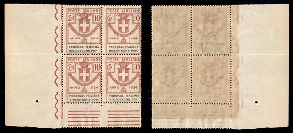 1924 - 10 cent Biblioteche Pop. (34) in quartina bordo foglio - senza punto dopo Pop. (34b) in alto a sinistra - gomma integra (405++)