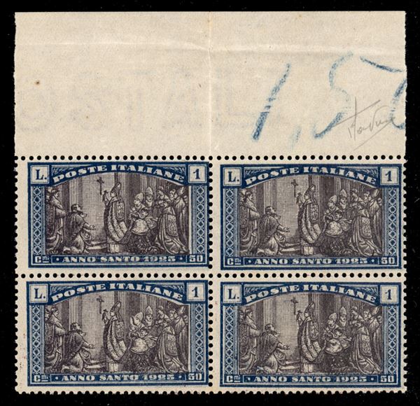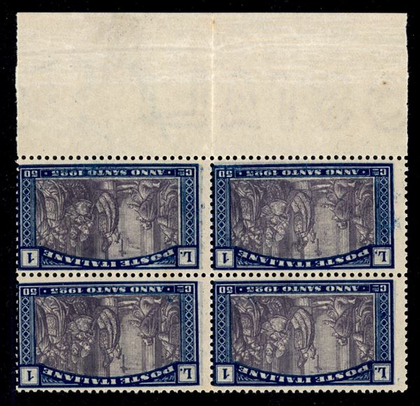 1925 - 1 lira + 50 cent Anno Santo (173 varietà) in quartina bordo foglio con stampa recto verso - gomma integra