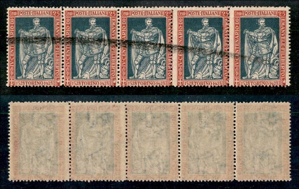 1928 - 25 cent Filiberto (231) - striscia di 5 - demonetizzato con tratto a lapis - gomma integra