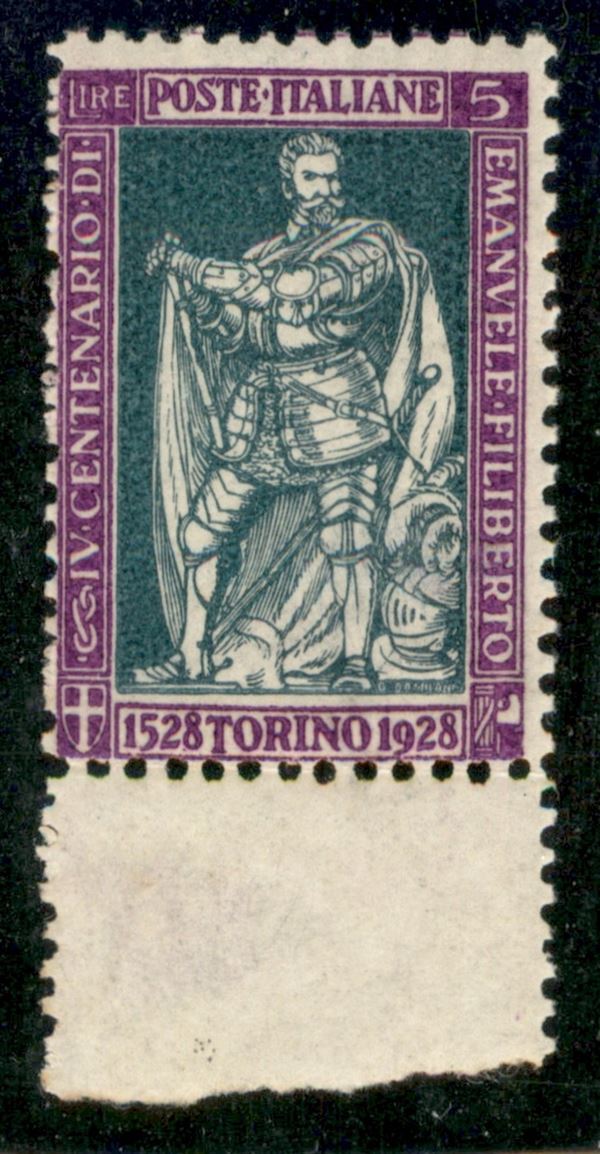 1928 - 5 lire Emanuele Filiberto (229) - bordo di foglio - gomma integra