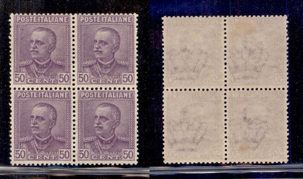 1928 - 50 cent Parmeggiani (225a - violetto) in quartina - gomma originale (integra su 3 pezzi) - ben centrato (850+)
