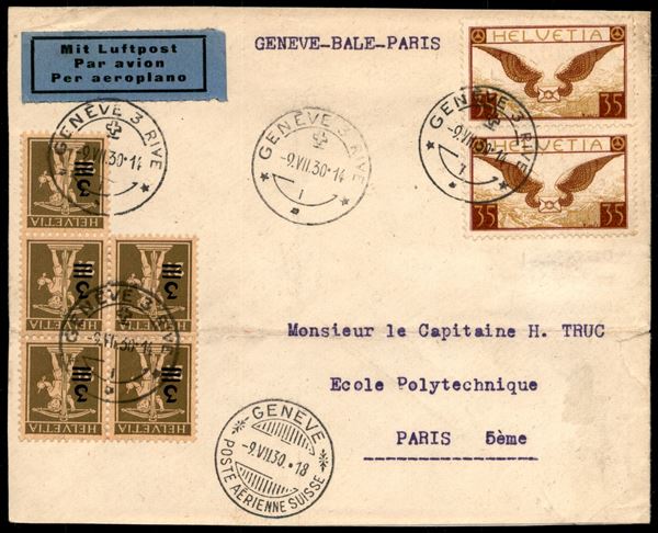 1930 (9 luglio) - Ginevra Basilea Parigi - coppia del 35 cent (233) + blocco di cinque del 3 cent su 2 1/2 (239) - aerogramma per Parigi