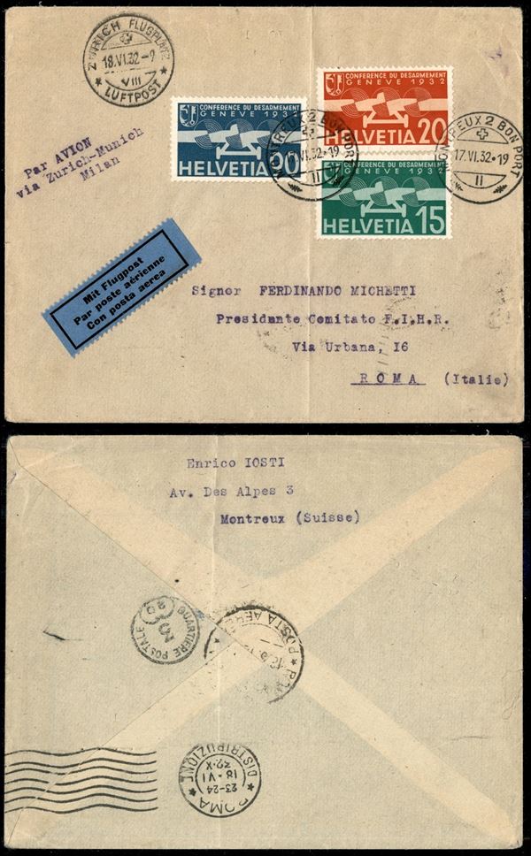 1932 (17 giugno) - aerogramma da Montreux a Roma via Zurigo Monaco Milano