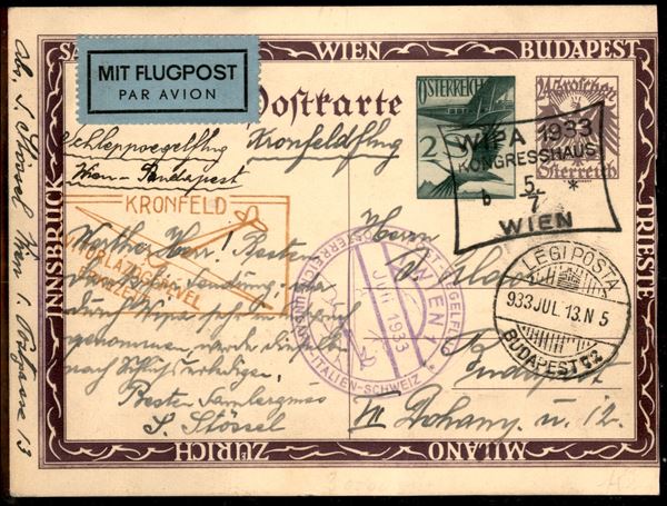 1933 (5 luglio) - Volo a Vela Konfeld Vienna Budapest - cartolina postale del volo