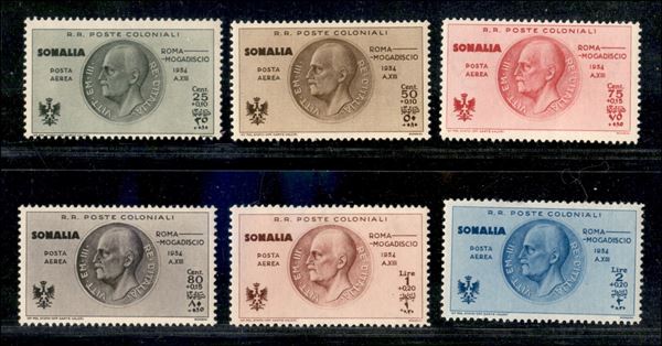1934 - Volo Roma Mogadiscio (A7/12) - i primi 6 valori della serie - gomma integra - 2 lire dentellatura carente in alto