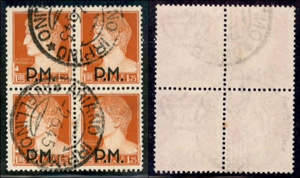 1942 - 1,75 lire P.M. (10 varietà) - quartina usata - intera filigrana lettere verticale (lungo la dentellatura centrale) a sinistra nella coppia di destra