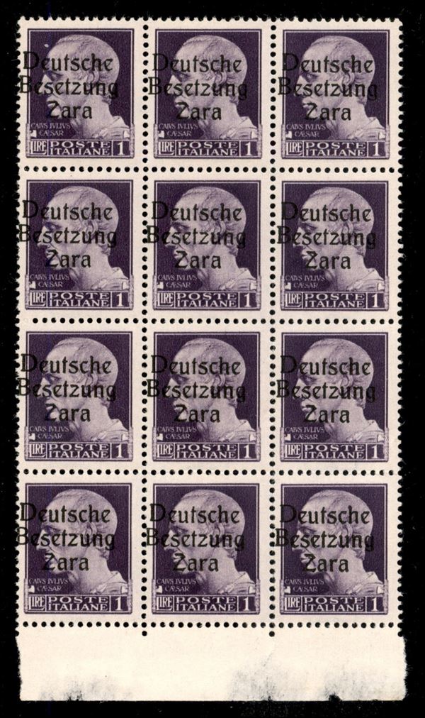 1943 - 1 lira (9e) con soprastampa spostata a sinistra - blocco di 12 (pos. 66/98) - gomma integra - dentellatura aperta in verticale in basso a destra (tra 77 e 98)