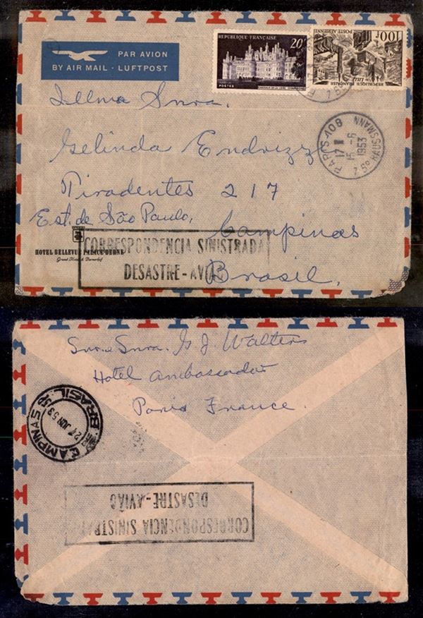 1953 – Correspondencia Sinistrada Desastre Aviao – aerogramma da Parigi (15/6) a Campines (27/6)
