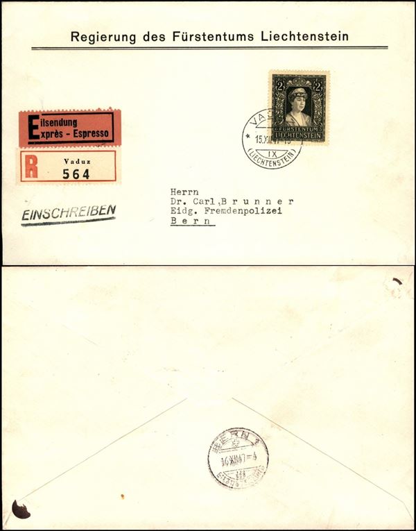 2 franchi Principessa Elsa (256) - FDC raccomandata espresso - Vaduz 15.12.47