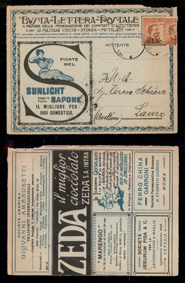 20 cent (2) - frontespizio di busta speciale (Nazionale 21/30) per Lauro del 18.11.21 - complementare (109) a lato strappato nell'uso (700/1.600)