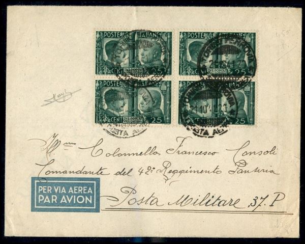 25 cent Fratellanza (454) - due coppie su aerogramma da Torino alla P.M. 27 del 21.10.41 - Raybaudi
