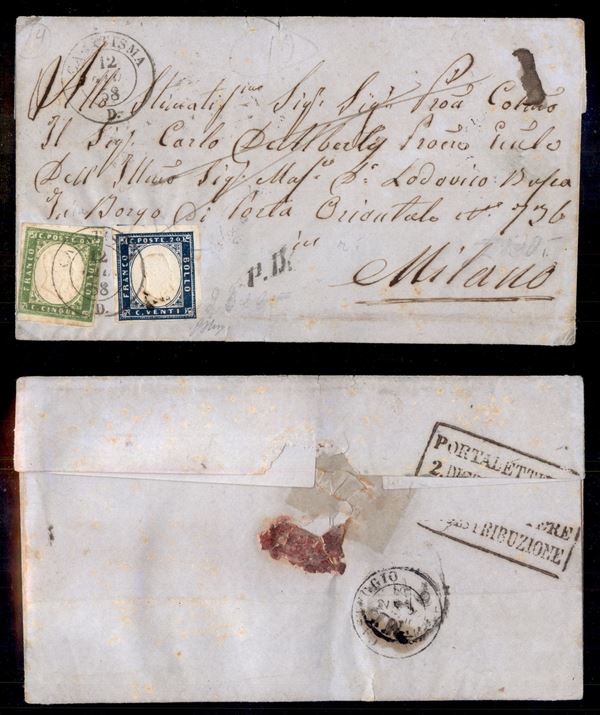 5 cent (13Ah - stampa difettosa) + 20 cent (15Aa) - lettera da Casatisma a Milano del 12.6.1858 (6.700+)