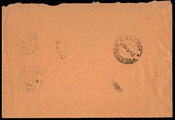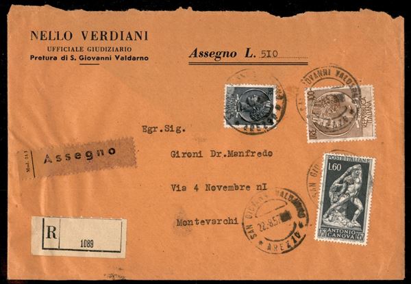 5 lire + 100 lire Turrita + 60 lire Canova (762 + 785 + 813) su raccomandata assegno del 22.8.57 da S. Giovanni Valdarno a Montevarchi