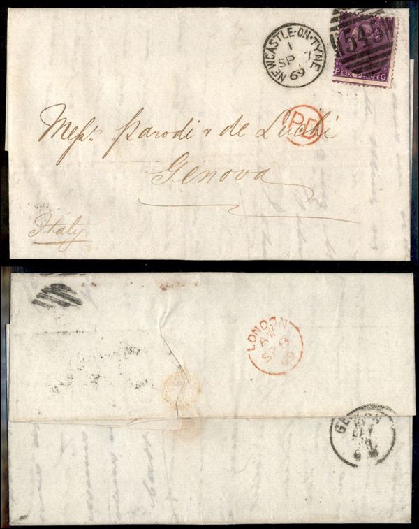 6 pence (30 - tav. 8) su lettera da Newcastle a Genova del 7.9.69 - dentellatura spostata (Postage a cavallo)