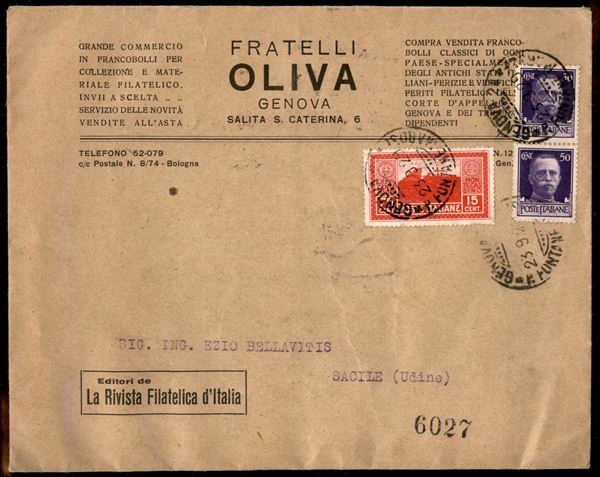 75 + 15 cent Montecassino (265) + coppia verticale del 50 cent Imperiale (251) su busta "Fratelli Oliva" da Genova per Sacile del 23.9.29