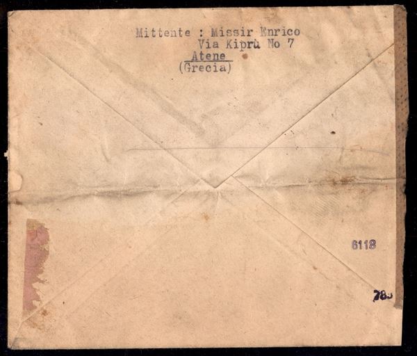 Aerogramma affrancato con 7 dracme Mitologica (377) + coppia del 50 lepta Storica (399 - difetti) + 25 dracme Storica (407) da Atene per l'Austria con data di difficile interpretazione