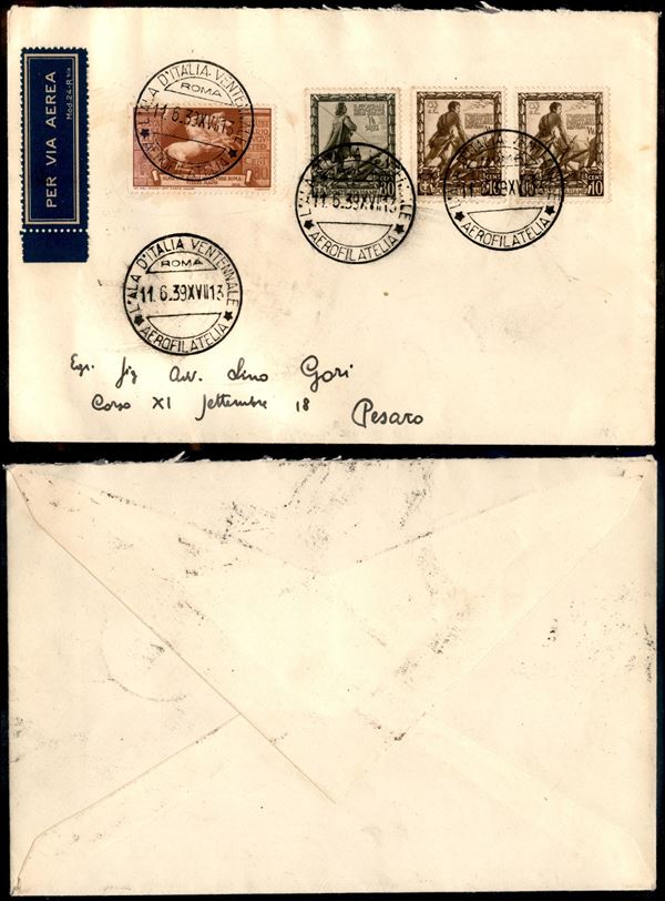 Aerogramma l'Ala d'Italia Ventennale - busta affrancata con Impero + Augusto (108 Posta Aerea + 439 + 442) per Pesaro del 11.6.39