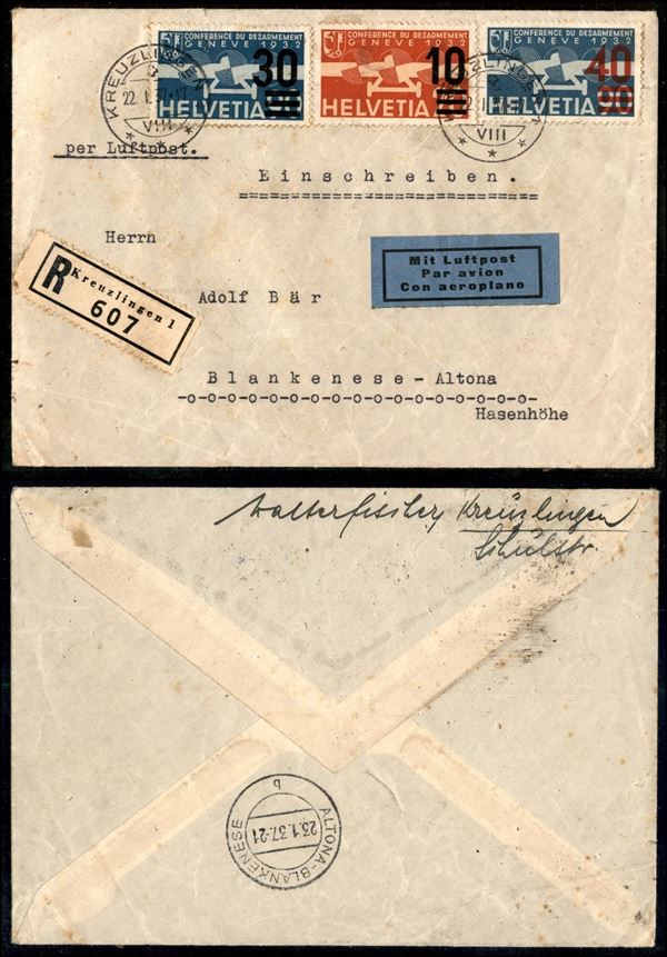 Aerogramma raccomandato affrancato con P. Aerea (A21/A22+A24) da Kreuzlingen 1 a Altona del 22.1.37