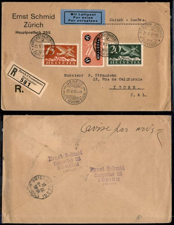 Aerogramma raccomandato da Zurigo a Tours del 21.5.31