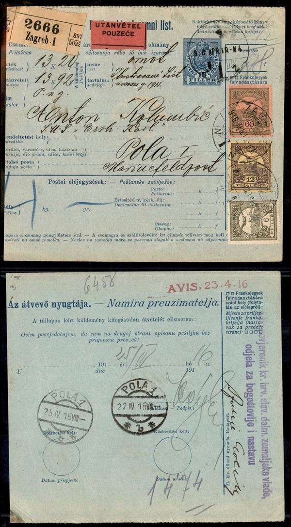 Austria/Ungheria - Bollettino Pacchi da Zagabria a Pola del 18.4.16 con affrancatura multipla