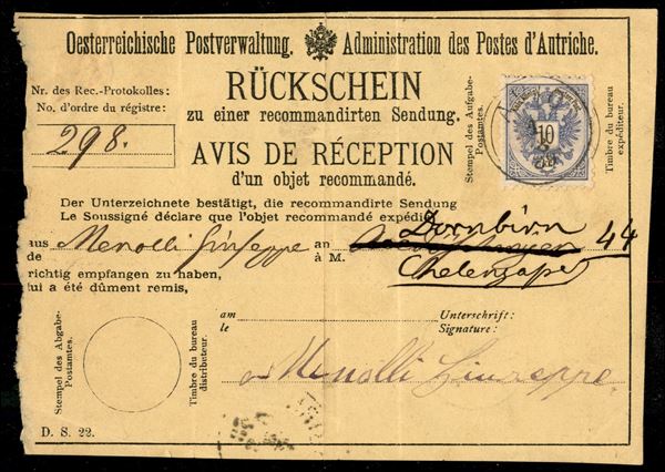 Avio - 10 kreuzer (47) su Avviso di Ricevimento di raccomandata del 8.8.89