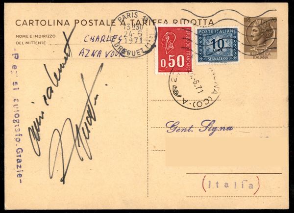 Aznavour Charles (cantante) - autografo su cartolina del 1971