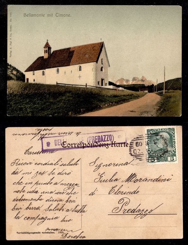 Bellamonte (Predazzo) (P.ti 7) - cartolina (Cimone) per Predazzo del 3.8.09