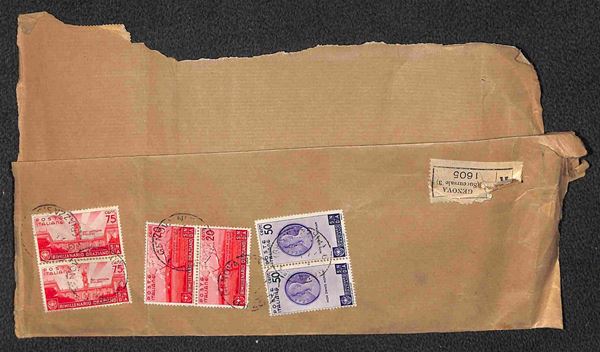 Bimillenario Oraziano - Frammento di grande busta raccomandata "Ernesto Marini" da Genova per Sacile del 14.4.37 affrancata con 10 cent singolo (398) + coppia verticale del 20 cent (399) + striscia orizzontale di 4 del 30 cent (400) + coppia orizzontale del 50 cent (401) + coppia verticale del 75 cent (402) - interessante