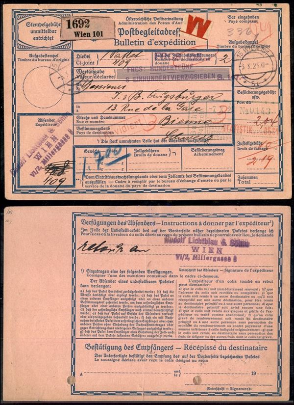 Bollettino pacchi assicurato per 105 franchi d'oro da Vienna a Bienne (Francia) del 3.10.25
