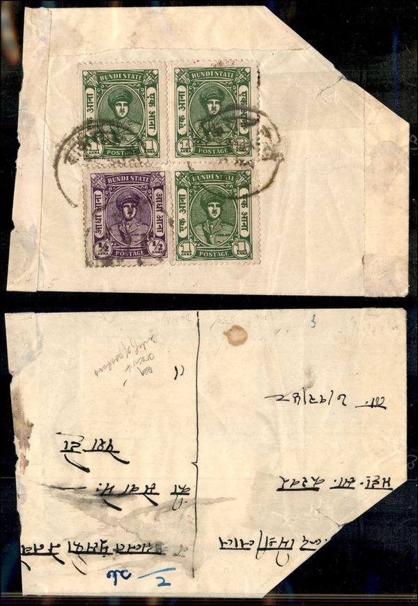 BUNDI STATE - Parte di busta affrancata con ½ anna + tre 1 anna (87+88) – difetti