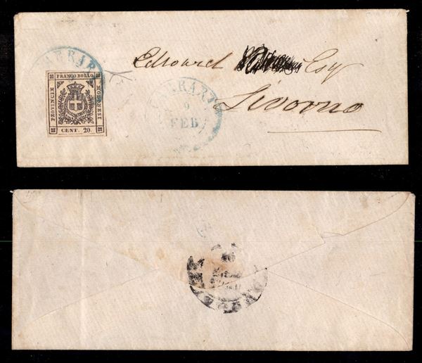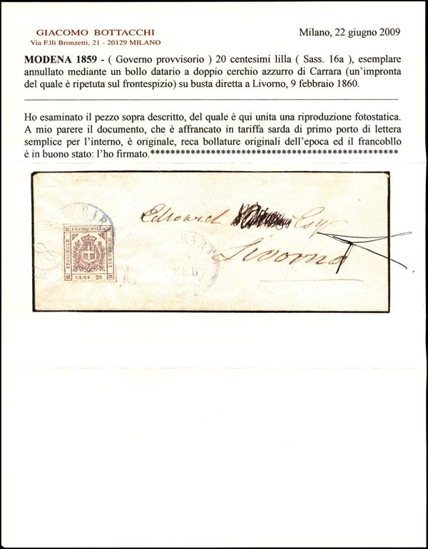 Carrara (azzurro - P.ti 8) - 20 cent (16a) toccato in alto a destra - bustina per Livorno del 9.2.60 - cert. Bottacchi (15.900)