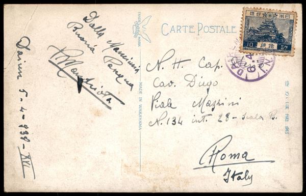Cartolina affrancata con 10 sen da Dairen a Roma del 6.4.38