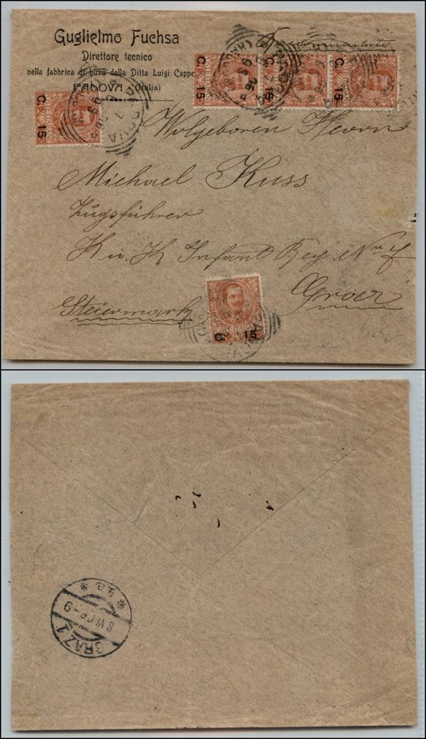Cinque 15 cent su 20 cent Floreale (79) su busta Padova 7.6.1906 per Graz - Leggera piega centrale della busta