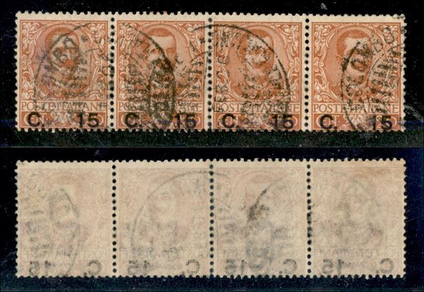 Colombo Piroscafo Postale Italiano – striscia di 4 del 15 cent su 20 Floreale (79) con leggero decalco