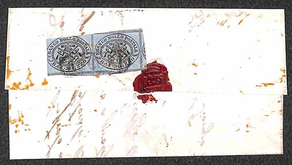 Coppia orizzontale del Mezzo bai celeste grigio (1a) - usata come tassa al retro di letterina da Ascoli a Montalto del 27.9.55