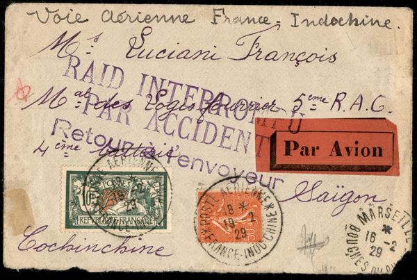 Crash Flight - Aerogramma da Marsiglia a Saigon del 16.2.29 con la linea Francia Indocina - "Raid Interrompu Par Accident Retour a l'Envoyeur"