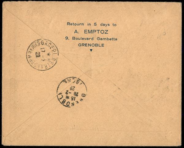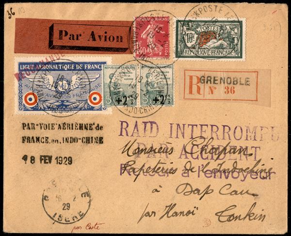 Crash Flight - Aerogramma raccomandato da Grenoble a Hanoi del 19.2.29 con la linea Francia Indocina - "Raid Interrompu Par Accident Retour a l'Envoyeur"