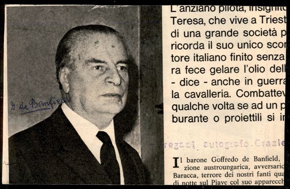 De Banfield Goffredo (aviatore) - autografo su ritaglio di giornale applicato su cartoncino del 1970