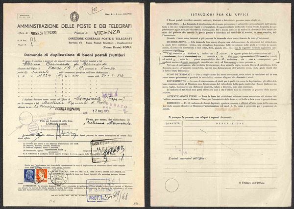 Domanda di Duplicazione con valori di Imperiale (253 + 254) usati fiscalmente - Vicenza 22.5.43