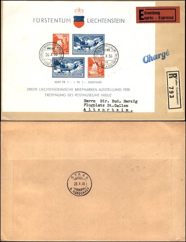 Foglietto Esposizione Filatelica di Vaduz (B2) - raccomandata espresso per Altenrhein del 26.10.36