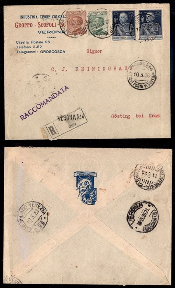 Giubileo - Coppia del 1 lira (187) + complementare su raccomandata da Verona a Graz del 10.3.26