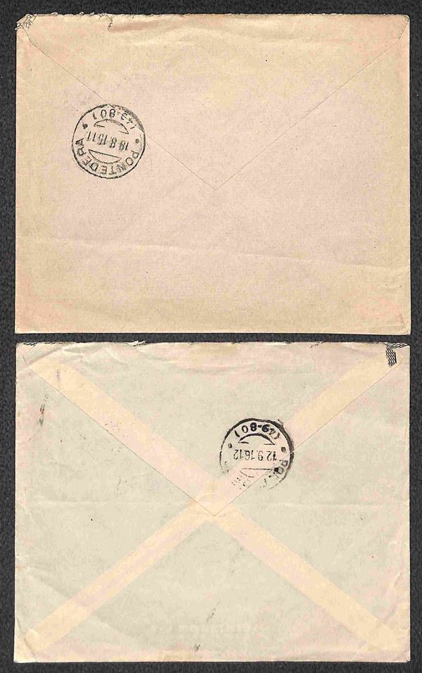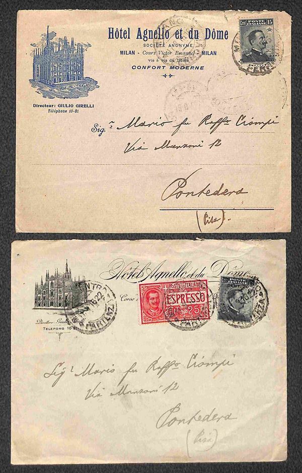 Hotel Agnello et du Dome Milano - due buste intestate per Pontedera del 1915/1916 con diverse affrancature (96 - 106 + 1 Espressi)