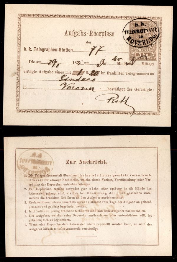 KK Telegrafenant in Roveredo - ricevuta del 29.1.75