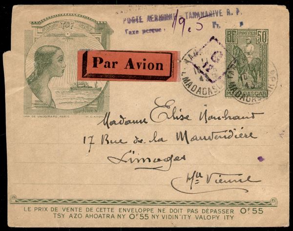 Madagascar et Depandances / Poste Arienne - Tananarive R. P. / Tax e Percue 19,5 fr - Aerogramma per Limoges 16.5.45