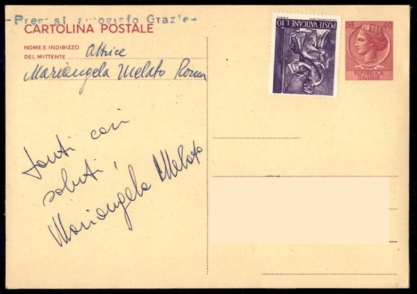 Melato Mariangela (attrice) - autografo (F - C) su cartolina postale con saluti