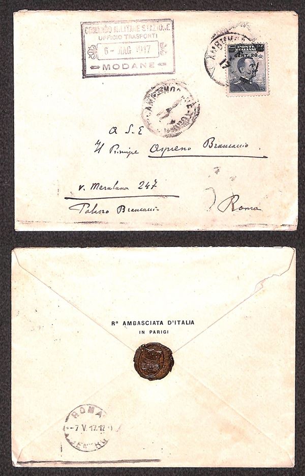 Modane/Comando Militare Stazione + Amb. Modane Torino su 20 cent (106) - busta per Roma del 6.5.17
