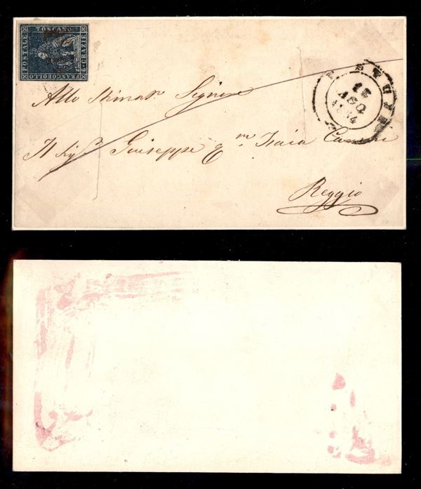 PD (rosso - P.ti 6) - 6 crazie (7d) preciso a sinistra - frontespizio di lettera da Pistoia a Reggio del 13.8.54 con tagli di disinfezione