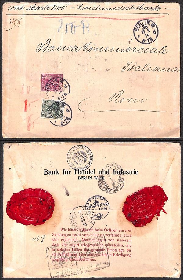 Perfin - Assicurata per 200 marchi da Berlino a Roma del 11.8.14 - splendidi sigilli