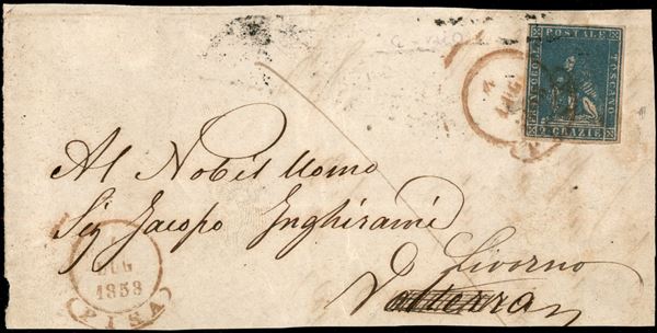 Pisa (rosso - P.ti R2) su 2 crazie (13) - frontespizio di lettera per Volterra del 4.7.58 - cert. AG (4.500+)