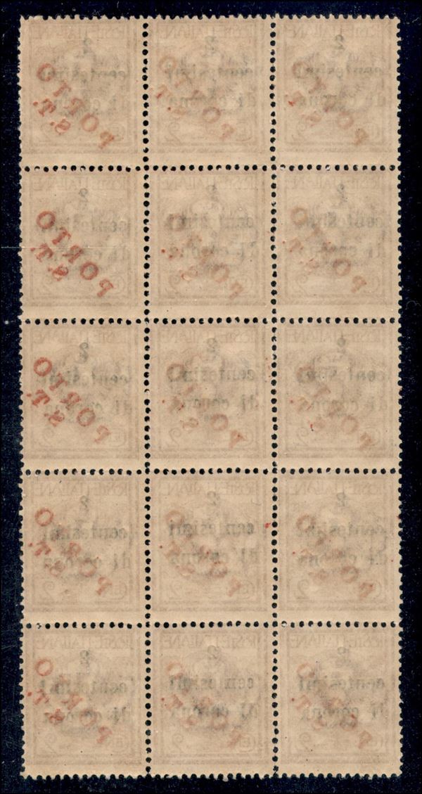 Porto S.T. su 2 cent su 2 (134 - varietà) - blocco di 15 - decalco parziale - gomma integra - non catalogato